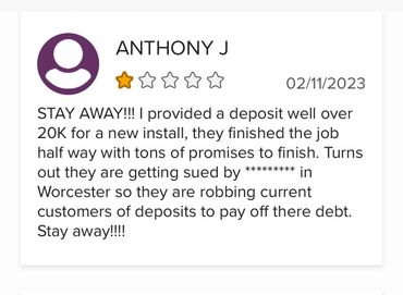 They ran into financial decline in 2020 right after they opened. It was almost like they didn't even care to even pay anything off to start it was so fast. Instead of paying for their equipment and parts they ran up a $100,000+ figure tab with their supply house, and pocketed all proceeds from customers in the process. Once their supply house sued them for $200,000+ grift, they continued to take full deposits from new jobs and claimed no equipment available because of COVID. The reason they had no equipment is their supplier was sueing them - see photos!